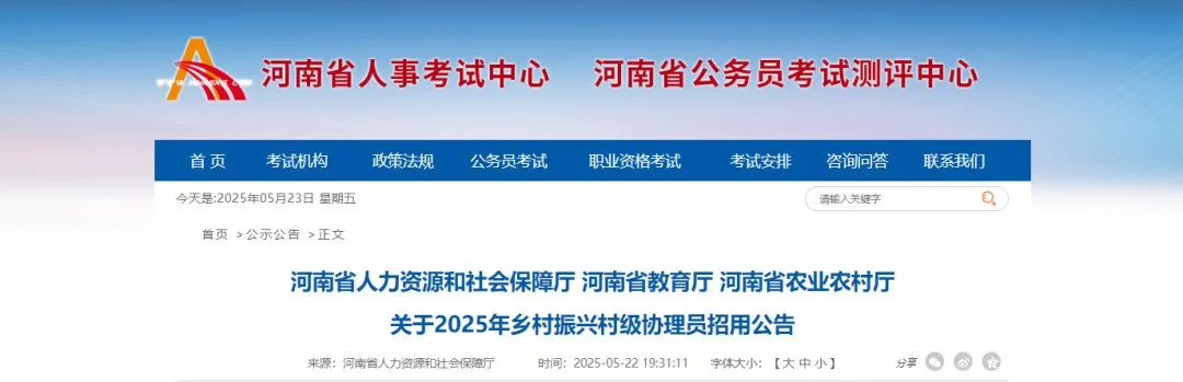 2025年5月22日河南省人力资源和社会保障厅、河南省教育厅、河南省农业农村厅联合发布招用公告。网址:
