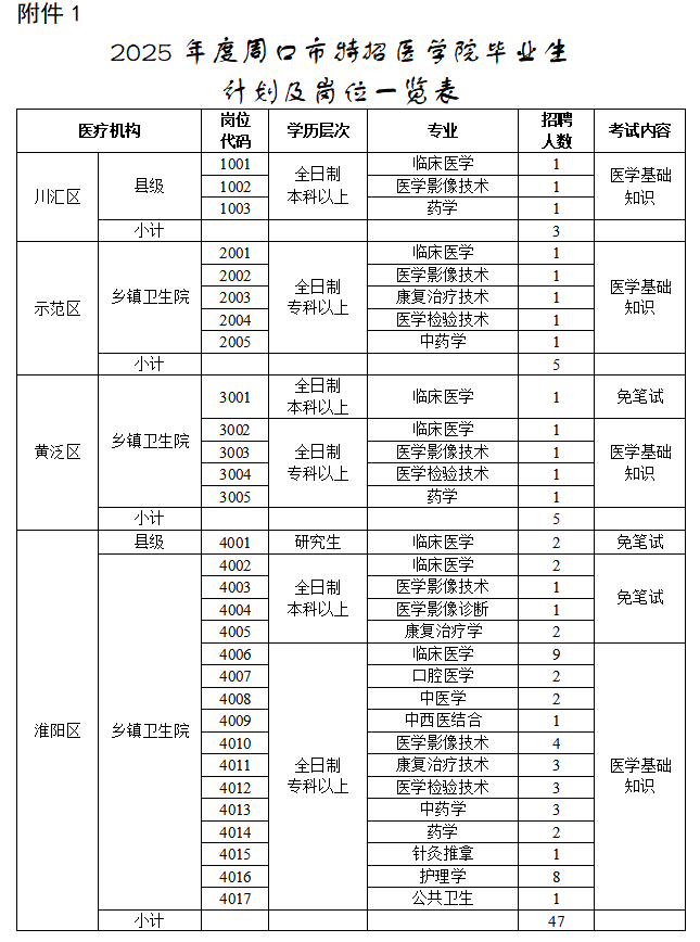 医学院毕业生特招计划不受择业期限制,全市拟招聘特招医学院校毕业生602人,其中为县级医疗机构招聘研究生9人、本科生75人,专业包括:临床医学、口腔医学、中医学、中西医结合、医学影像技术、医学检验技术、康复治疗学、药学、中药学、护理学、医学信息管理、公共卫生等;为乡镇卫生院招聘本科生48人、专科生470人,专业包括:临床医学、口腔医学、中医学、中西医结合、康复治疗技术、医学影像技术、医学检验技术、药学、中药学、针灸推拿、护理学等专业。各县市区招聘专业及计划详见附表1-1。
